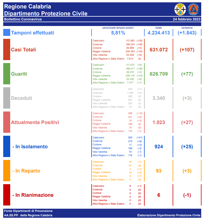 – Reggio Calabria: CASI ATTIVI 198 (14 in reparto, 0 in terapia intensiva, 184 in isolamento domiciliare); CASI CHIUSI 209065 (208143 guariti, 922 deceduti).