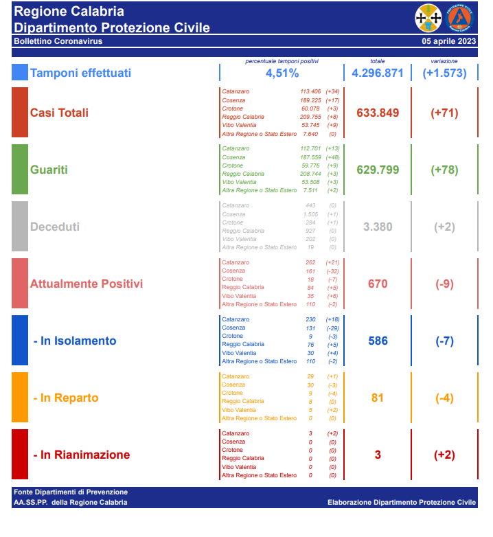 – Reggio Calabria: CASI ATTIVI 84 (8 in reparto, 0 in terapia intensiva, 76 in isolamento domiciliare); CASI CHIUSI 209671 (208744 guariti, 927 deceduti).